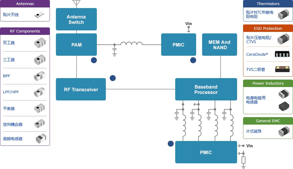 介绍使用于IoT(Internet of Things) / M2M模块的贴片天线、滤波器等RF产品,功率电感器、高频电感器、贴片NTC热敏电阻等产品。