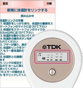 2 体温計をスマートフォンのマイクに近づけて、体温計の電源を入れて、「体温計リンク」をタップしてください。もう一度体温計のボタンを押してください。