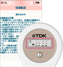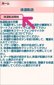 2 体温計をスマートフォンのマイクに近づけて、体温計の電源を入れて、「体温転送開始」をタップしてください。その後すぐに一度体温計のボタンを押してください。