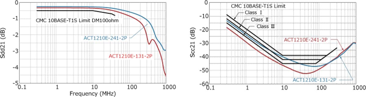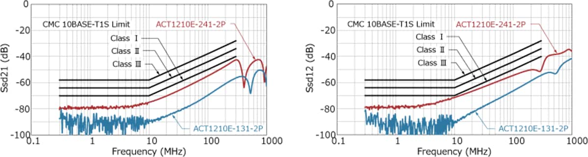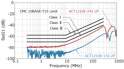 CMC 器件的规格由 OPEN Alliance “10BASE-T1S EMC 测试规范(针对CMC)”定义,其中寄生电容被分为 I 类(17 pF以下)到 IV 类(7 pF以下)不等。ACT1210E-131-2P-TL00 是业内首款符合最严格的 IV 级标准的 CMC 产品。