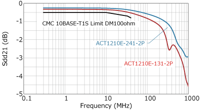 由于 10BASE-T1S 是一种不带交换机的多点接入,如果在一条线路上接入多个 ECU,那么线束的长度和分叉问题将导致反射或是 ECU的寄生电容成分变大,进而导致信号波形上出现振铃等影响通信质量的情况。因此,用于EMC对策的 CMC 其寄生电容必须尽可能小。