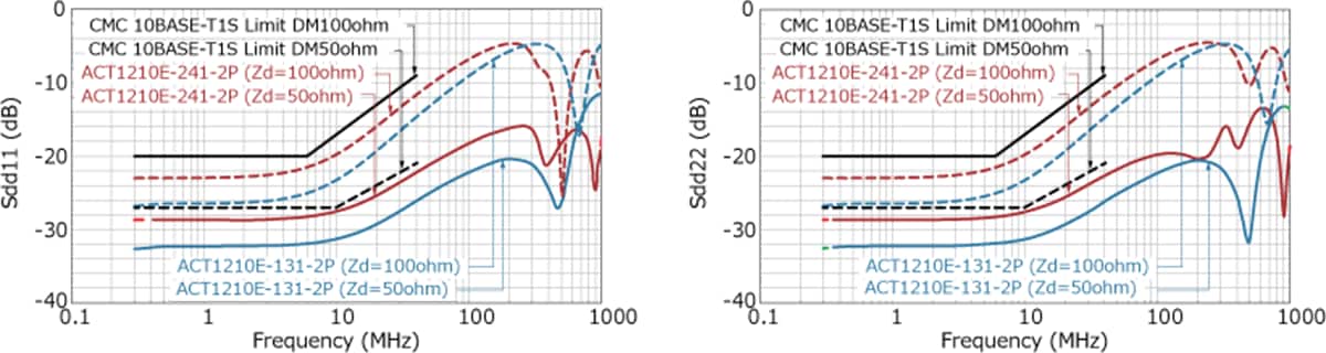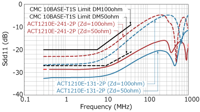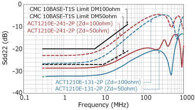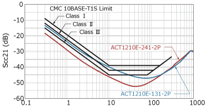 如上所述,OPEN Alliance在 10BASE-T1S 标准中定义了寄生电容和 S 参数的标准。标准中针对每种特性进行了分类,给出了各自对应的规格线,因此可以根据使用条件选择符合标准的部件。